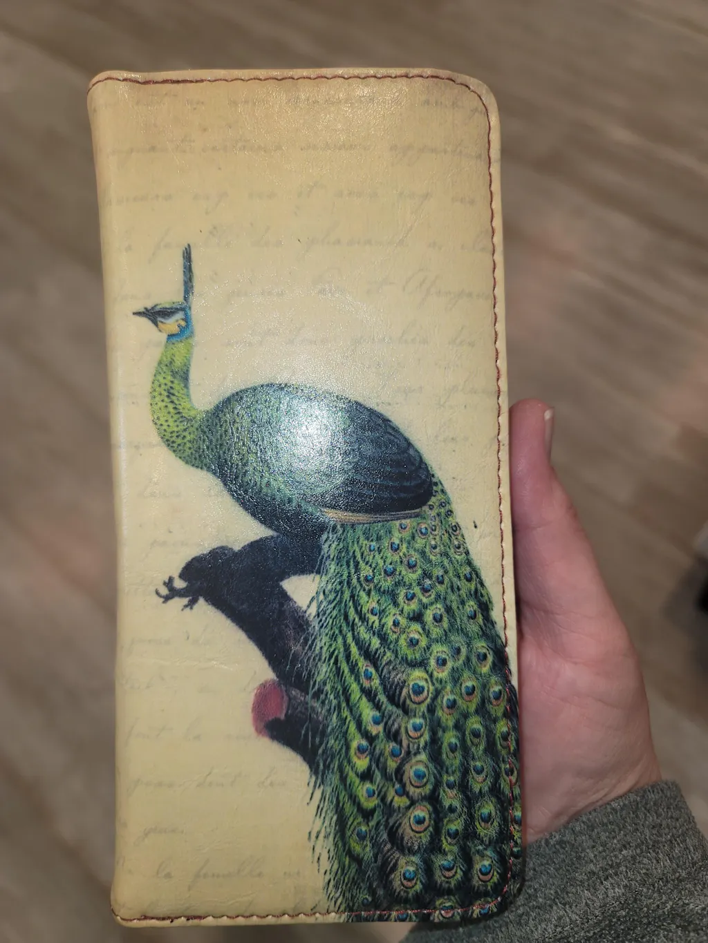 From Peacock collection designed by Mlavi Studio and made with cruelty-free faux/vegan leather & microfiber, this charming vintage style large vegan zipper wallet features whimsical peacock illustration. It's fun and functional: zipper closure to ensure all things inside save and sound, can carry smart phone including Iphone, center inner zipper pocket is wonderful for coins or receipts, two side slots are wonderful for different currencies should you travel internationally, for jet setter, it can also store your passport easily.